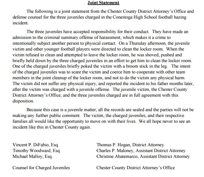 Fourteen months ago in March 2016, the TE School District fired five Conestoga High School football coaches and head coach John Vogan resigned after Chester County DA Tom Hogan charged three football players with sexual assault of a younger player. The investigation stemmed from a freshman football player’s allegations that three senior players held him down and penetrated his rectum with a broom handle in October.